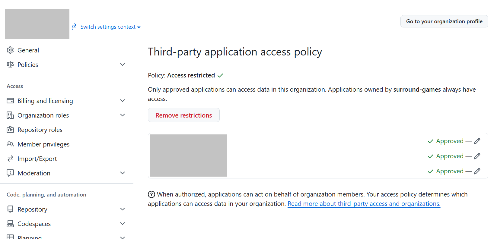 문제의 원인은 레포지토리가 속한 Organization의 액세스 정책 설정에 있었다. GitHub Organization 설정을 살펴보면 Third-party application access policy라는 항목이 있는데, 이 설정이 기본적으로 Access restricted로 되어 있다. 이 제한 정책이 활성화되어 있으면 Organization에서 명시적으로 허용하지 않은 서드파티 애플리케이션은 해당 Organization의 레포지토리에 접근할 수 없게 된다.