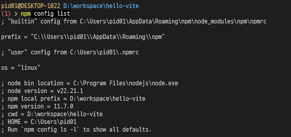 위 명령을 실행하면 현재 npm 설정을 볼 수 있는데, 아래처럼 os = "linux"가 찍혀 있었다.